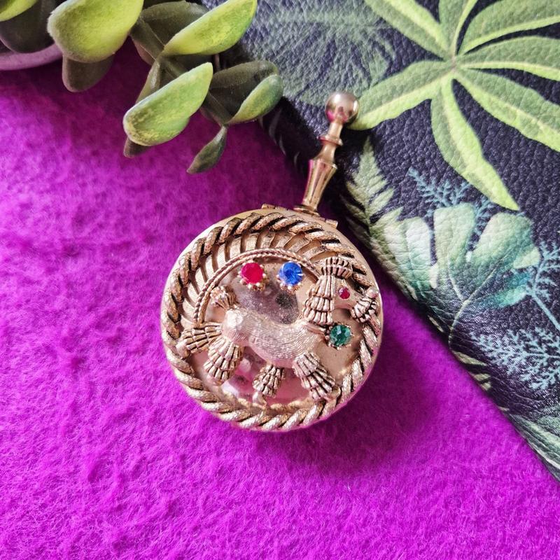 Очень интересный аксессуар. Эту мини-сундук 70-х годов можно использовать и для хранения таблеток-витаминок, и как пепельницу, и как емкость для твердых духов или блеск для губ. Золотистый сплав Шкатулка декорирована песиком и разноцветными кристаллами. Состояние красивое. Размер - 4 х 6,6 см. Доданий выдеоогляд.