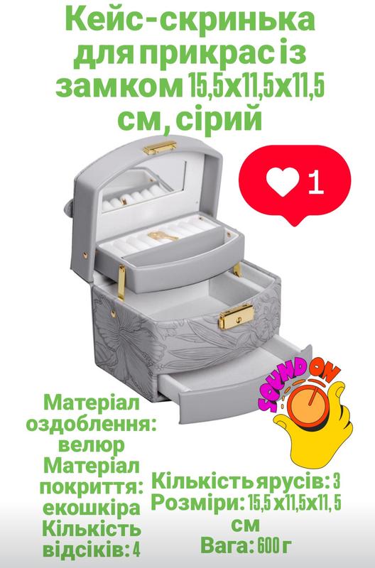 Шкатулка для украшений из эко кожи, 3 яруса – идеальный органайзер для бережного хранения ваших ювелирных изделий. Компактный и функциональный дизайн с размерами 15.5×11.5×11.5 см обеспечивает удобство использования и легкость хранения. Выполненная из качественной эко кожи, эта шкатулка станет стильным дополнением любого интерьера, сочетая в себе практичность и элегантность, а замок обеспечит сохранность Ваших украшений. Основные характеристики органайзера для хранения бижутерии размеры шкатулки для украшений 15.5×11.5×11.5 см; количество ярусов - 3 шт; количество отсеков - 4 шт; материал корпуса - экокожа; внутреннее покрытие - велюр; зеркало в комплекте. Шкатулка оборудована тремя вместительными ярусами, предлагающими 4 разнообразных отсеков. Это позволяет аккуратно разместить кольца, серьги, цепочки, браслеты и другие украшения, предотвращая их повреждения и спутывание. Внутреннее покрытие из мягкого велюра обеспечивает дополнительную защиту от царапин и повреждений. Основные преимущества шкатулки для украшений из эко-кожи Экологичная кожа приятна на ощупь, долговечна и устойчива к внешним повреждениям, а велюровое покрытие внутри бережно хранит драгоценности и предотвращает появление царапин. Благодаря 4 отдельным отсекам и трем просторным ярусам, все украшения аккуратно размещены и всегда находятся под рукой. Современное исполнение и сдержанные цвета органично вписываются в любой интерьер, превращая органайзер в стильный элемент декора. Встроенное зеркало добавляет функциональности и облегчает выбор украшений. Качественный замок обеспечивает сохранность и защиту ювелирных изделий от случайного открытия и потери. Отличное решение для подарка по любому поводу: День рождения, 8 марта, годовщина, День святого Валентина или Новый год. Дополнительным преимуществом модели является встроенное зеркало, удобное для примерки украшений и ухода за собой. Надежная застежка гарантирует безопасное хранение ваших драгоценностей, исключая случайное открытие шкатулки. Шкатулка из экокожа отлично подходит в качестве подарка на любой праздник, а также будет полезным приобретением для личного использования. Купить шкатулку для ювелирных изделий можно с доставкой по всей Украине. Характеристики: Материал отделки: велюр Материал покрытия: экокожа Количество отсеков: 4 Количество ярусов: 3 Размеры: 15,5х11,5х11,5 см Вес: 600 г Характеристики: Вес 0.6 кг Высота 11.5 см Гарантийный срок 14 дней Длина 15.5 см Материал корпуса МДФ Форма Прямоугольная Цвет Серый Ширина 11.5 см Внутреннее покрытие Велюр Количество ярусов 3 Материал покрытия Экокожа