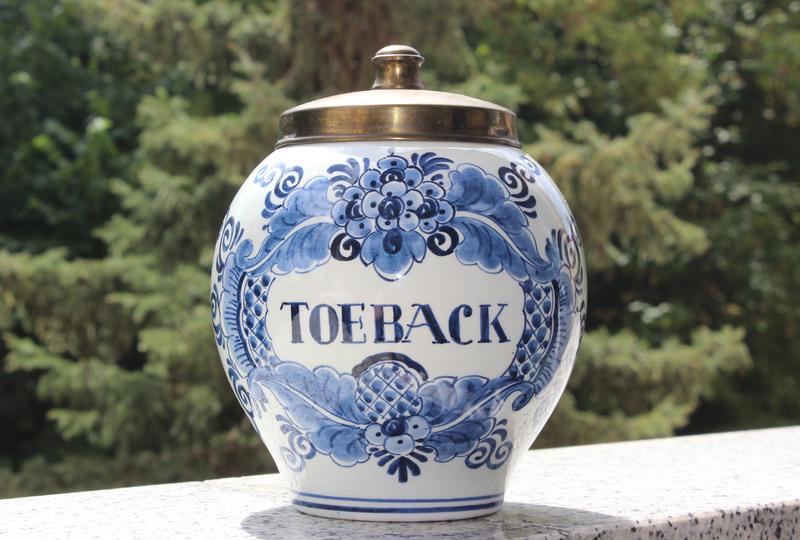 Банка для зберігання тютюну або тютюну, виготовлена з фарфору, кришка з латуні. Ручна робота. Делфтський фаянс із біло-блакитним розписом, Голландія 50-х рр. Розміри: висота — 19 см, | — 8 см Вага: 704 грами