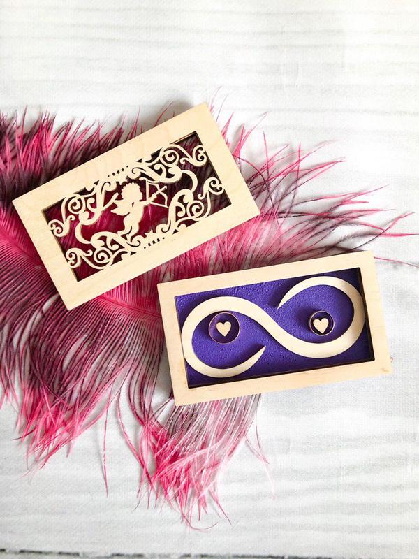 Шкатулка для обручальных колец "Купидон" и знаком бесконечности на успех. 14х8 см Красивая подставка для колец на свадьбу— незаменимый аксессуар для заключения брака в ЗАГСе или во время красивой выездной церемонии. Этот важнейший элемент свадебного ритуала будет притягивать взгляды ваших гостей и фотографов! Деревянные подставки или коробочки для обручальных колец на свадьбу будут великолепно выглядеть на фотографиях и в руках молодоженов во время торжественного обмена кольцами! Материал - шлифованная фанера 4мм, 6 мм