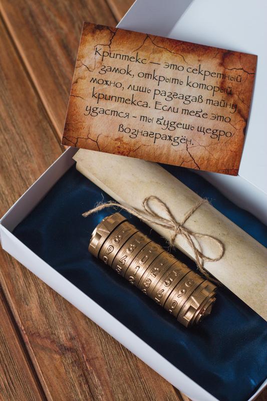 Самый популярный ответ на вопрос "Что тебе подарить?" — это, конечно же, "Не знаю"! В таких случаях есть риск либо прогадать с подарком, либо пойти лёгким путём и презентовать деньги. И если вы, как и мы, выбираете второй вариант, то сто процентов спрашивали себя: как же подарить их небанально и с душой? Криптекс — уникальная математическая головоломка, которая превратит сам процесс открывания подарка в игру! Чтобы добраться до презента, придётся разгадать целых шесть математических задач и ребусов — так что за приз придётся побороться. Мы составим такую головоломку с любыми датами, числами и шифрами — такой подарок подойдёт и взрослому, и ребёнку! К каждому криптексу есть инструкция и описание того, что это такое и что с ним делать. А для большей атмосферности подарка Вы можете заказать специальный лист с заданиями. Мы — то, что Вам нужно! Проверим? Вы любите быструю доставку и не хотите, чтобы с Вашим заказом тянули до последнего. Оформили — отправили! Вам нравится, когда можно позвонить и уточнить детали, а если звонить не хочется — Вы с радостью напишете; А если Вы написали и задали вопрос — Вам хочется, чтоб сообщение не висело сутками и Вам быстро ответили :) Вам нравится соответствие цены и качества, ведь речь идёт о подарке :) Давайте вместе подберём идеальный подарок, который запомнится надолго :)