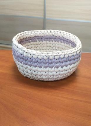 Корзинка диаметром 17 на высоту 9 см, интерьерная, связана из трикотажной пряжи, 100% хлопок. Эко стиль.