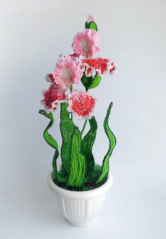 Рожева та фіолетова орхідея з бісеру у вазоні. Ціна вказана за 1 шт. Розмір 35 см