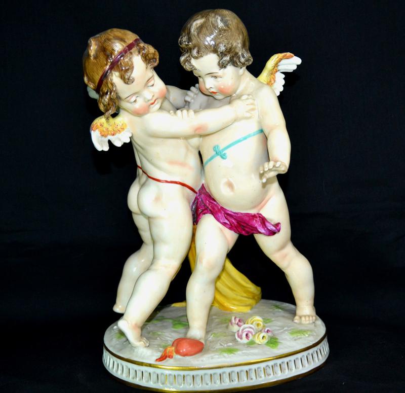 Композиция «Амуры, борющиеся за сердце» Конец XIX, Германия, Людвигсбург. Фарфор. По модели Жана Батиста Пигаля. Идеальное состояние. Высота 27см.