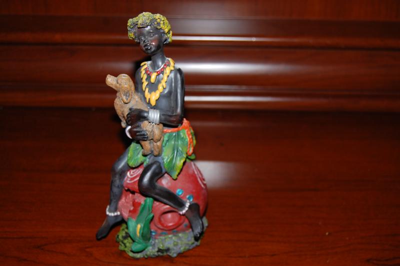 Статуетка з полімерного матеріалу дівчина мулатка із собачкою. Заміри на фото. Вага — 276 грамів. міцне фарбування. Без нюансів.