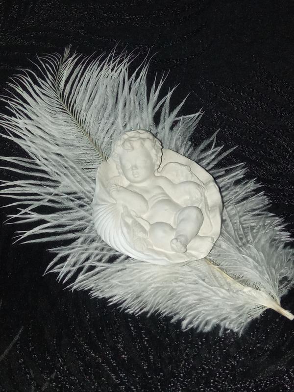 Миниатюрная статуэтка ангелочка в ракушке. Длина 7 см. Ручная работа из гипса. Станет отличным подарком или украшением вашего интерьера.