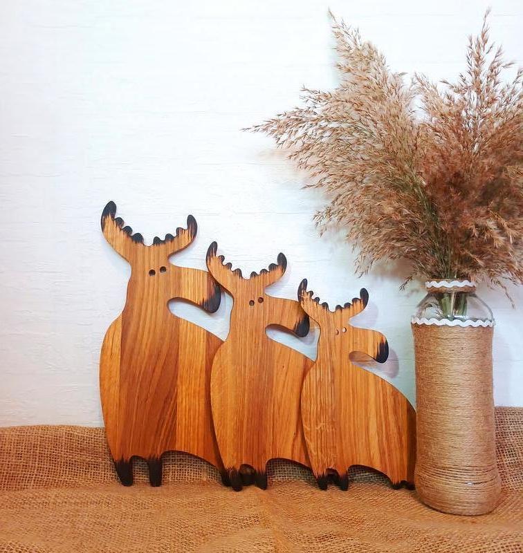 ТРИ ЛОСЯ. Дерев'яні статуетки із натурального дуба, ручної роботи. Фігурки лосів вирізані вручну, оброблені за допомогою техніки випалу, покриті натуральною олією з бджолиним воском. Розмір фігурок лосів: Велика - 35*18,5 см, Середня - 29,5 * 15,5 см, Маленька – 22,5*12 см. ТРИ ЛОСЯ - це гарний та неординарний декор для дому, для полиці. А ще – це чудовий подарунок на День народження, новосілля чи Новий рік. Можуть використовуватись як декор аполицю, або дощечки для нарізки сиру абощо.