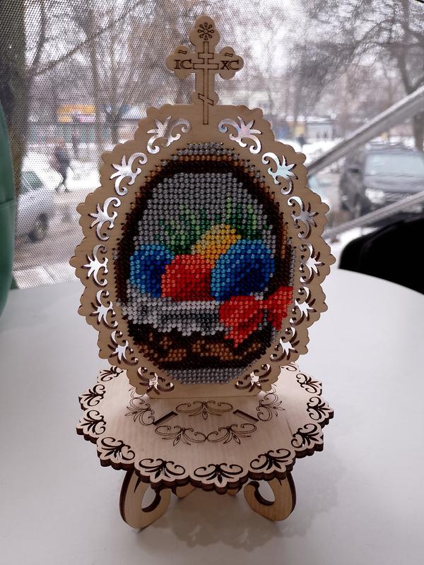 Писанка из березовой фанеры, вручную вышитая бисером. Размер яйца 11*13 см, диаметр подставки 11 см, общая высота готового изделия 20 см. Обратная сторона заклеена фетром.