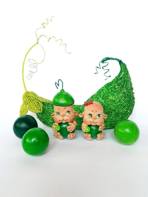 Декоративные горошинки из полимерной глины в бисерном стручке 10 на 15 см, горошки 4 см
