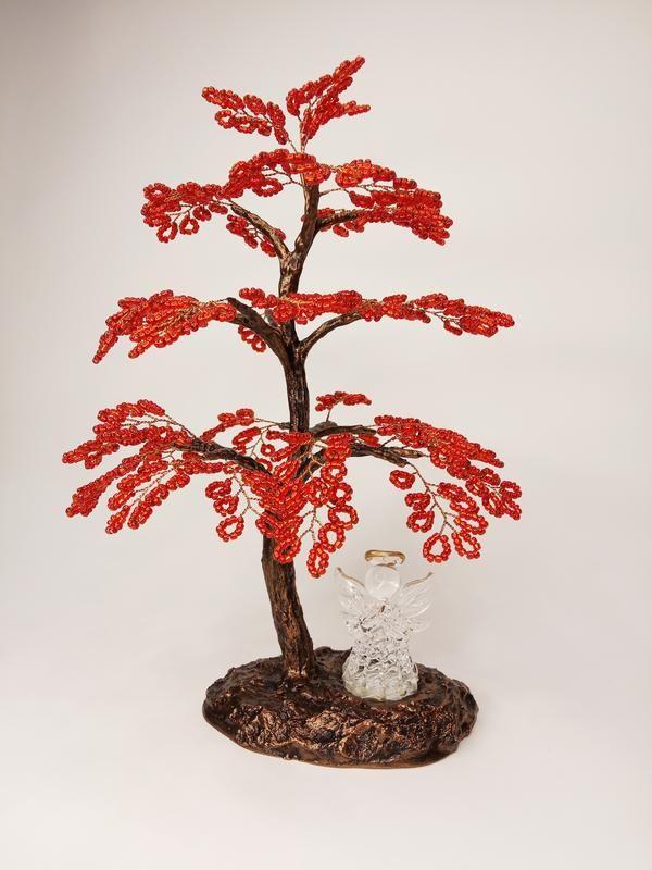 Дерево изготовлено из бисера красного цвета, декорировано стеклянной статуэткой ангелочка. Высота 22 см.
