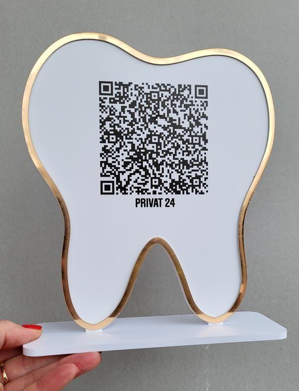 Такая табличка-зуб с qr кодом может содержать профессию присоединиться к социальным мере или другой вашей аккаунта, Быстрый и простой способ направить людей на нужный сайт, Придание доступа к WiFi, ВАш Приват 24 для осуществления расчета Его можно разместить на столе, ресепшиные ⠀ Все по Вашему желанию! Для удобства в расчетах, рекламы и чтобы привлечь внимание ваших пациентов. А главное, это то, как она работает и легко считывается! Саме так, за 1 секунду! Так как сейчас большинство современных телефонов уже имеют приложение для считывания qr кода, то Вы сможете в секунду это сделать камерой своего телефона, ⠀ Отличная и практичная идея подароку стоматологу, ортодонту к профессиональному празднику День стоматолога 9 свирепство, на день рождения стоматологу, подарок по случаю открытия стоматклиники, стоматкабинета Материал - белая ПВХ 5 мм толщина, золотой полистирол 1 мм печать самого кода ! Возможно заказать и двусторонний вариант Возьмите во внимание, что на изготовление нужно 2-3 дня. От Вас порадуйте ссылки на необходимый ресурс Товар изготавливается по заказу