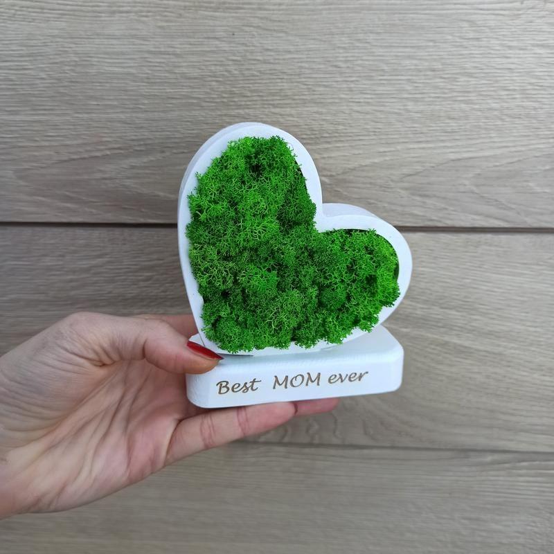 подарок маме, мамочки на день матери или подарок на день рождения маме - сердце из дерева на подставке с стабилизированным мхом с награвированным приветствием На фото продемонстрировано сердечки из дерева и покрытые маслом воском и белого цвета. Эти надписи - это гравировка лазером. Поэтому можно сделать их на разных и разных языках. При оформлении заказа пожалуйстаulьте Ваш текст. Итак, размеры, ориентируемся по ширине сердца: - 14 см - 370 грн - 17 см - 520 грн - 20 см. - 650 грн Стоимость указана с гравировкой. Само сердце может быть дерево масло-воск, а также окрашено в белый цвет по Вашему желанию Цвет мха Вы можете выбрать другой из нашей палитры. Сам мох не потеряет внешний вид и будет служить до 10 лет. Его не нужно поливать и ставить на солнце.