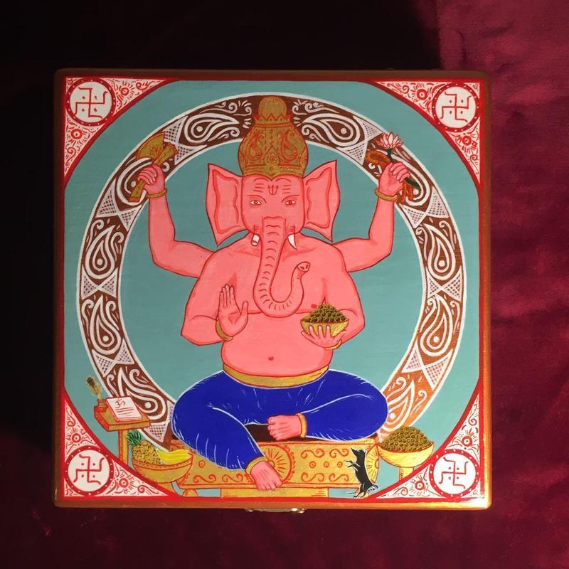 Торг Скринька "Ганше" Індуський бог мудрості та добробуту, що зберігає знання. Його велика слонова голова символізує здатність розуміти Світ і широту знань, великі вуха — здатність чути. Один із його бивнів зламаний, що означає неідеальність цього світу. Ганеша солодкечка, завдяки чому Його зображують із солодощами (рисові цукерки ладандус) і великим животом, який також показує, що Ганеша може "переварити" все, що є в Світі. Правою нижньою рукою Віненьшає, у верхній тримає бойову сокиру, якою відсікає прихильності; у лівій лівій нижній руці Він тримає солодкі підноски а у верхній — мотузку, щоб прикріпити розум до істинних знань і лотос, символ благості. Ганеша правої ногою йде на землю, адже Він йде назустріч тим, хто з відкритим серцем звертається до Нього. У Його ніг сидить щура — переможений Ганеший велетні Ґаджамукху, що став його їздовим тваринам. Кришка символізує бажання, які керуються мудрістю, адже щура чекає, коли Ганеша дасть змогу їй смакувати солодощів. На бічних стінках скриньки написана мантра Ом Шрі Ганшая Намаха " ⁇ ⁇ ⁇ ⁇ ". Ручний розпис акриловими фарбами. Шкатулка має розміри 16*16*5,5 см, всередині обшита оксамитом. Ціна 1200 грн, можливий торг. Доставка Києвом кур'єром, по Україні новою поштою. Деталі в ЛС або пишіть на пошту *************@********* #шкатулка #ручна_розмальовка #Ганес #********