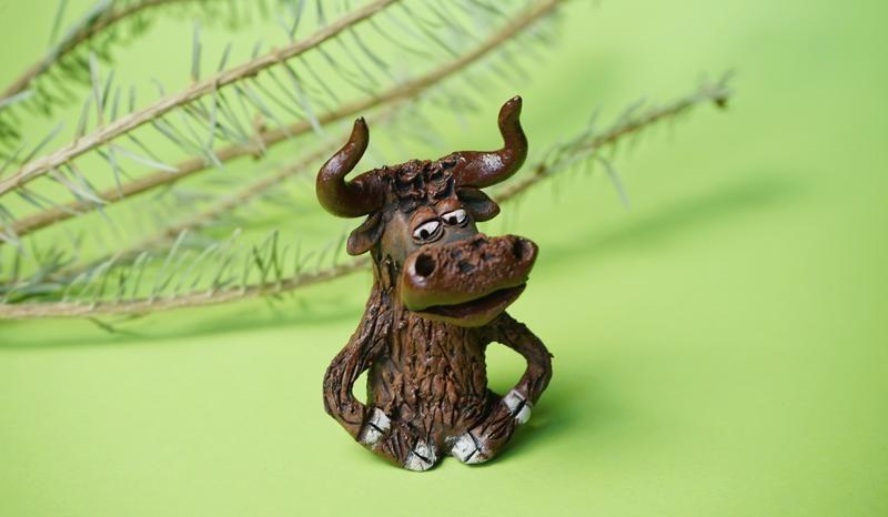 Авторская, керамическая фигурка бычка, ручной работы. (5x7cм)