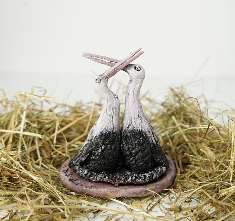 Авторская керамическая Статуэтка аисты ручной работы (12x10см) Пара птиц cимволизируют любовь и верность, крепкие партнерские или супружеские отношения. Такие сувениры в подарок дарят с пожеланиями активизации романтических отношений, гармонии в семейной жизни, долгосрочных партнерских отношений. Очень хороший подарок на день влюбленных, свадьбу, юбилей или годовщину свадьбы. Товар под заказ