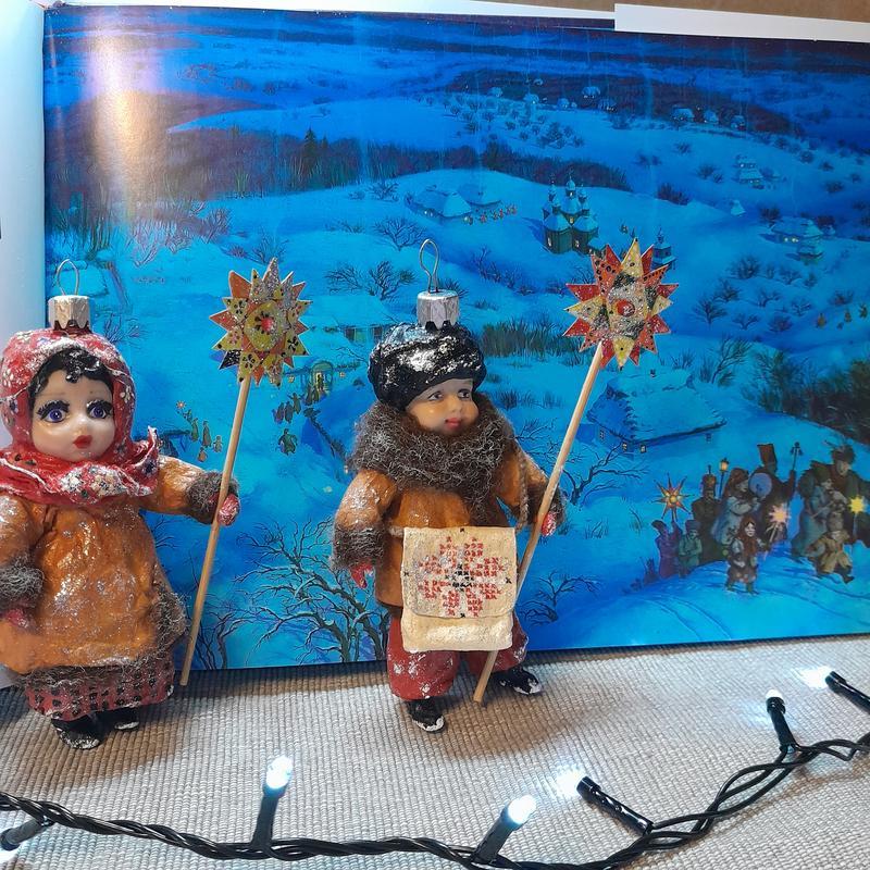 Виробник: Власне виробництво Тип аксесуара: Інший тип аксесуару Авторські ялинкові прикраси колядники звіздарі. Виготовлені з вати, шерсті та полімерної глини. Приблизно 13 см. Принесуть свято у Ваш дім) Ціна за 1 од. Нова радість стала, Яка не бувала, Над вертепом звізда ясна У весь світ засіяла. Де Христос родився, З Діви воплотився, Як чоловік пеленами Убого повився. Пастушки з ягнятком Перед тим дитятком На колінця припадають, Царя-Бога вихваляють. Ой Ти, Царю, Царю, Небесний Владарю, Даруй літа щасливії Сего дому господарю. Сего дому господарю І сій господині, Даруй літа щасливії Нашій славній Україні.