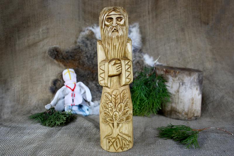 Род – головний Бог слов'ян. Творець Всесвіту, Всебог, Прабог, творець людського роду, духовна сила, яка єднає усі покоління: покійних, живих і ще ненароджених. Він є ядром, що зміцнює народ і формує його майбутнє. Спочатку Род був заточений в Світовому Яйці (в самому собі), потім розбив його. Характеристика: Висота: 28 см Ширина: 7 см Глибина 7 см Матеріал: дерево, Обробка: різьблення по дереву, шліфування Покриття: моріння, олією та воском Колір світло коричневий Дивіться також інші вироби