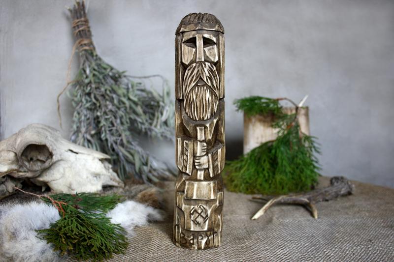 Сварог в русской мифологии - прабог, бог неба, света и огня. Он — небесный коваль, который выковал Мир, населил Землю разными существами и создал первых людей. Сварог - покровитель кованства и свадьбы, главный бог творческой силы природы, отец украинского пантеона. Он выковывал первый35плет и первую пару, научил людей пользоваться огнем, варить и ковать медь и железо, орать и посевывать, молоть зерно и пекти из него хлеб. Характеристика: Высота: 25 см Ширина: 5 см Глубина 5 см Материал: дерево, дуб Обработка: резьба по дереву, шлифовка Покрытие: моревание, маслом и воском Цвет - коричневый Смотрите также другие изделия