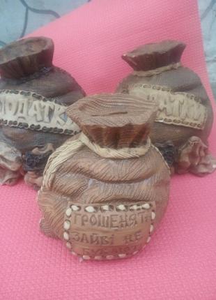 ручная работа копилка мешок. различные надписи:лки,платки лишние не бывают,налоги.высота высочайшей-17 см (податки),самые имения (налоговы)-11 см.