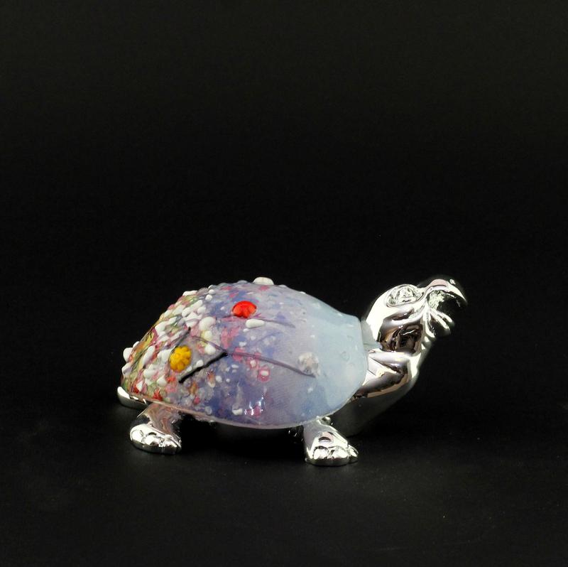 Зроблена з гальванопластика, відразу приваблює своєю витонченою кольоровою гамою. Спинка тварини, немов райдужний розпис, стильно поєднується із сріблястого кольору тулубом. Черепаха з фен-шуй є оберегом, символом захисту та єднання. Розташована навпроти входу в будинок фігурка цього земноводного створює надійний тил для мешканців будинку, посилює взаєморозуміння поколінь.