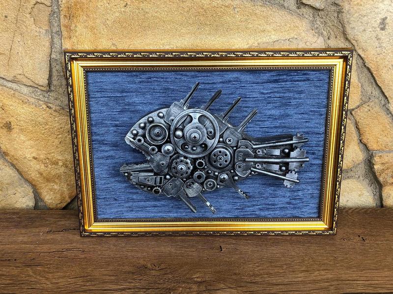 Ищете необычный подарок? Вот он! Эта рыба в стиле стимпанк станет отличным дополнением вашего интерьера и привлечет внимание своим уникальным дизайном. Изготовленная с использованием различных механизмов и частей от различных устройств, она придает особый шарм любому пространству. Размеры: - 34 см x 24 см Цвет: серебряный Эта рыба - идеальный подарок на свадьбу, день рождения, День матери, День отца и другие праздники!