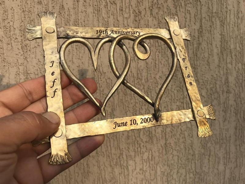 Представляем вам замечательную ручную бронзовую рамку с двумя сердцами, соединенными друг с другом. Это отличный подарок на свадьбу, 8-ю годовщину свадьбы (бронзовая годовщина), 19-ю годовщину (где традиционно выбирают бронзовые подарки), для выражения любви, на помолвку, День Святого Валентина и другие особые случаи! Размеры: высота: 12 см длина: 17 см Цвет: не крашеный. Имеет красивый бронзовый цвет первоначальной бронзы. В стоимость входит гравировка на раме (верхняя часть рамы или нижняя часть рамы). Выполнено из 100% бронзы. Ручная работа. Достаточно тяжелый для своих размеров! В некоторых местах он может иметь темную тень в результате окисления бронзы.