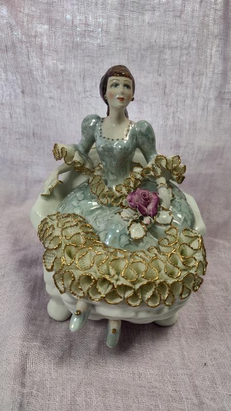 статуєтка дама с веером кружевной фарфор , есть потери ( на волосах бант) , висота 21 см