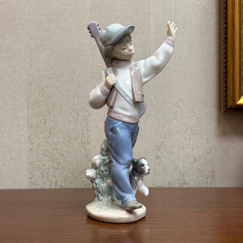 Фарфоровая статуэтка Lladro, № 6015, оригинальное название «Wednesday's Child Boy (Ребенок среды, мальчик)». Глянцевый фарфор. Номер модели 01006015. Клеймо Lladro. Сделана в Испании. Выпускалась с 1993 по 1997 гг. Скульптор: Juan Huerta. …юный музыкант весело шагает в сопровождении своего четырехлапого друга... Эта статуэтка, одна из 14 статуэток (с номерами 6011-6024) небольшой серии, которая называется «Дни недели» и посвященных детям (мальчикам и девочкам), рожденным в разные дни недели. Например, статуэтка под № 6011 называется «Понедельник-Мальчик», № 6012 – «Понедельник-Девочка», № 6013 – «Вторник-Мальчик» и так далее... при этом, вторым персонажем композиции являются или котята или щенки… Редко встречающаяся статуэтка. Высота - 20 см; Ширина (макс.) – 8,5 см. Состояние идеальное. Трещин, сколов, повреждений нет. В оригинальной коробке.