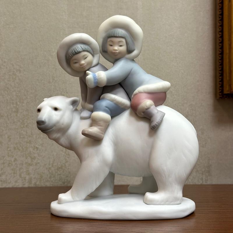 Фарфоровая статуэтка Lladro № 5353, оригинальное название «Eskimo Riders (Эскимосские всадники)», в испанском варианте - «Esquimales Sobre Osito (Эскимосы на медведе)» Бисквитный фарфор (матовая отделка). Номер модели 01005353. Клеймо Lladro. Сделана в Испании, выпускалась в период с 1986 по 2019 гг. Ручная работа. Скульптор: José Puche. ...судя по всему, от прогулки получает удовольствие вся троица. Думаю, что такое-же удовольствие будете получать и Вы, глядя на это произведение мастеров Lladro… Высота – 18 см. Ширина максимальная - 13 см. Состояние идеальное. Трещин, сколов, повреждений нет. К сожалению, не в оригинальной коробке. В наличии, также, есть эта статуэтка в глянцевой отделке.