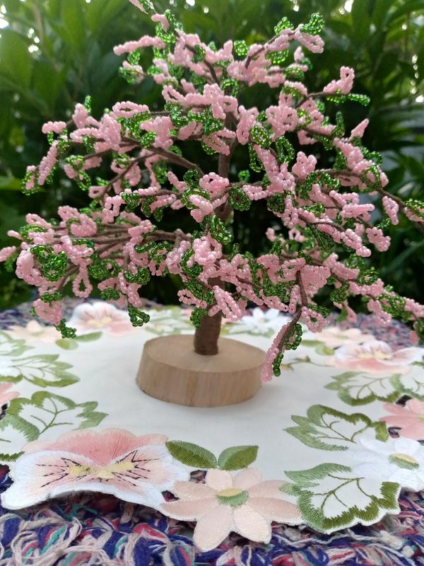 дерево из бисера с гибкими ветвями на деревянной подставке высотой 20см