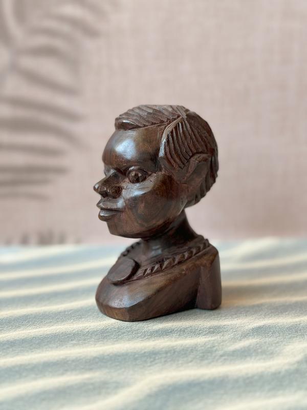 Старинная статуэтка из эбенового дерева, изготовленная в Африке в 1950х. Ручная резьба. Необычная резная статуэтка станет изюминкой любого интерьера и ценным подарком для любителей африканского декора. Размеры: Высота - 12 см Ширина - 6 см Глубина - 7 см