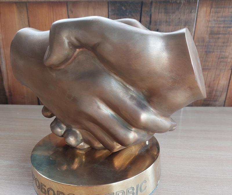 Бронзовая статуэтка Рукосжима, материал бронза, состояние отличное, присущая гравировка на компанию