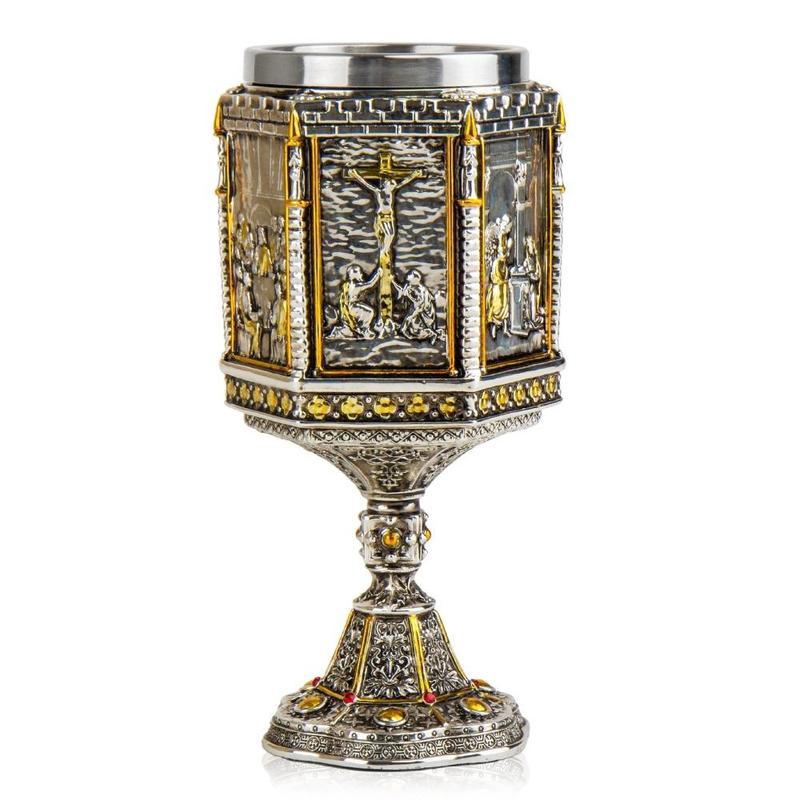 Кубок подарочный Veronese Святое причастие 18,5х7,5 см 200 мл бокал покрытый бронзовым напылением 177658 Высота кубка – 18,5 см, диаметр – 7,5 см. Объем – 200 мл Кубок "Святое причастие" - изысканный подарок для верующего человека, руководителя, друга, важного человека, радующего каждый день своим мастерством. Достаточно раз посмотреть, насколько подробно проработаны все детали и насколько изысканно и дорого он выглядит. Кубок выполнен из полистоуна (искусственный камень), покрытый напылением из бронзы. Внутри Вас ждет не менее приятный сюрприз в виде съемной емкости из нержавеющего металла, которую удобно извлекать и аккуратно ополаскивать, при этом не травмируя и не подвергая никаким температурам сам кубок. Не предназначен для практического использования. Упакован в красивую подарочную коробку. Благодаря надежной внутренней упаковке, изготовленной из пенопласта с углублениями для мельчайших деталей, Вы можете быть уверены в безопасности при транспортировке.