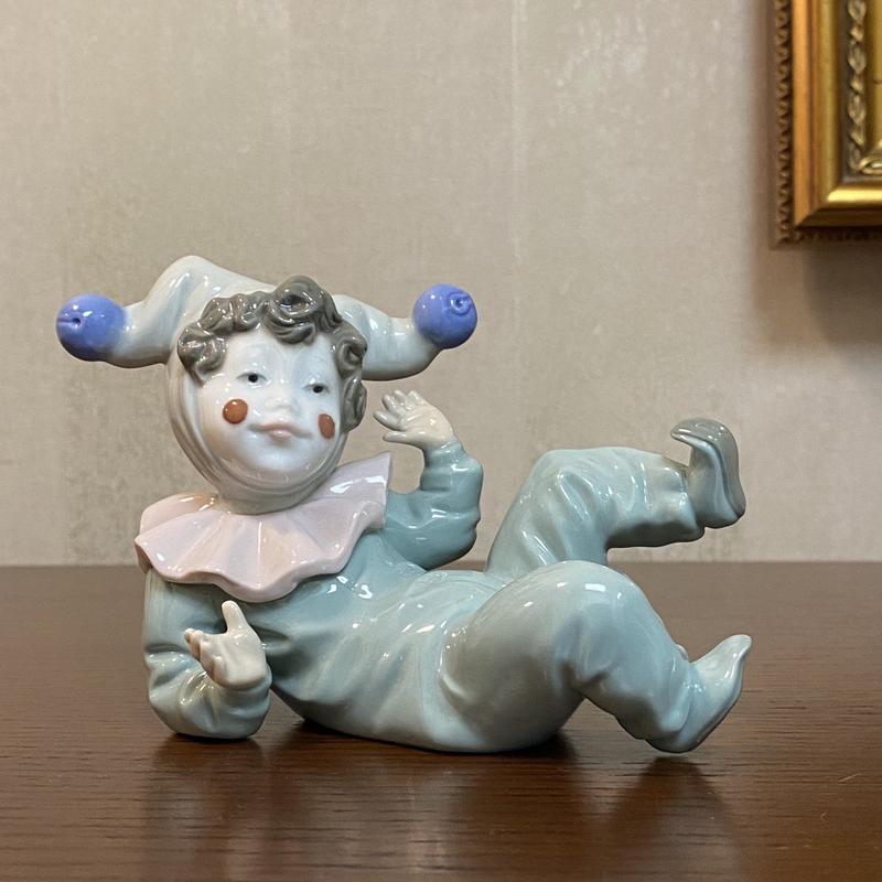 Фарфоровая статуэтка NAO (by Lladro), № 1066, оригинальное название «Jangles (Звоночек)», другое название - «Little Jester Lying (Лежащий маленький шут)». Глянцевый фарфор. Номер модели 02001066. Клеймо NAO by Lladro. Выпускается в Испании начиная с 1992 года. Ручная работа. Скульптор: Jose Puche. …улыбчивый молодой шут в зеленом костюме с бубенцами, улегся, уперевшись одной рукой в пол и приподнял ножку вверх… Он является одним из трех шутов / клоунов: - «Сидящий маленький шут» или «Бубенцы (Jingles)» № 02001065; - «Лежащий маленький шут» или «Звоночек (Jangles)» № 02001066; - «Маленький шут на коленях» или «Радость (Joy)» № 02001067. В НАЛИЧИИ ЕСТЬ ВСЕ 3 СТАТУЭТКИ. Высота - 9 см. Ширина максимальная – 13 см. Состояние: идеальное. Трещин, сколов, повреждений нет. Не в оригинальной коробке.