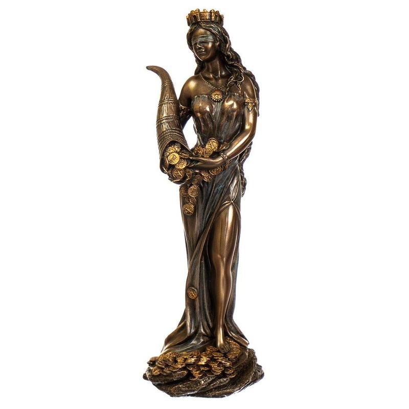 Статуэтка Veronese Фортуна 18 см 75416 Богиня Фортуна - воплощение женственности, непредсказуемой удачи, материального благополучия, безграничного счастья. Ее образ с давних времен связывался только с положительным влиянием на судьбы людей. Она проявлялась в заботе и покровительстве над избранными, которые волею слепого случая, независимо от финансового состояния и положения в обществе, имели честь попасть под ее покровительство. Рог изобилия в древнегреческой мифологии изображался устремленным вверх, всегда переполненный до отказа цветами, фруктами, виноградом, и принадлежал Плутосу - греческому богу богатства. В Средние века он приобрел качества святого Грааля, имевшие честь испить из которого получали несметные богатства, вечную молодость и жизнь, прощение всех земных грехов высота 18 см производитель Veronese материл-полистоун покрытый бронзой
