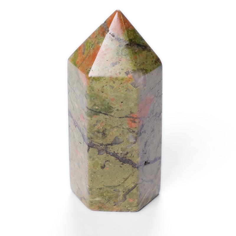 Статуэтка Стела из натуральной яшмы унакит. Статуэтка - размер 15*17*35 мм. Яшма унакит - окраска минералов бывает розовой, светло-зеленой, темно- зеленой, встречаются кристаллы с вкраплениями белого, красного, коричневого цветов. Кристаллы -- непрозрачные. Блеск -- шелковистый. Основные месторождения: Россия, Китай, Бразилия, Африка. В народной медицине бытует мнение, что унакит хорош для профилактики большого количества заболеваний. Бусы из этого минерала нужно носить, когда свирепствует грипп. Литотерапевты считают, что браслеты из унакита помогают при лечении ожирения. Считается, что этот камень нормализует пищеварение, уменьшает аппетит. Некоторые целители рекомендуют носить украшения из унакита женщинам, которые долгое время не могут забеременеть, так как, по их мнению, этот минерал благоприятно влияет на репродуктивную систему человека. Шары из этого камня используют для общеукрепляющего и тонизирующего массажа лица и тела. Унакит влияет на сердечную чакру. Свойства унакита направлены, прежде всего, на духовное развитие человека. Практикующие маги используют этот камень для изготовления оберегов от негативного влияния окружающей среды и потери позитивности энергии. В некоторых странах Европы чародеи рекомендуют людям, большую часть жизни проводящим в больших городах, носить браслеты из зеленого унакита. Такой браслет способен защитить от стрессов. Талисманы и амулеты: талисманом могут служить как изделия из унакита, так и небольшие кусочки необработанных камней. Унакит -- талисман молодых людей, желающих добиться успехов в жизни. Кольцо или перстень с этим камнем помогает своему хозяину духовно и умственно развиваться, способствует его внутреннему росту.