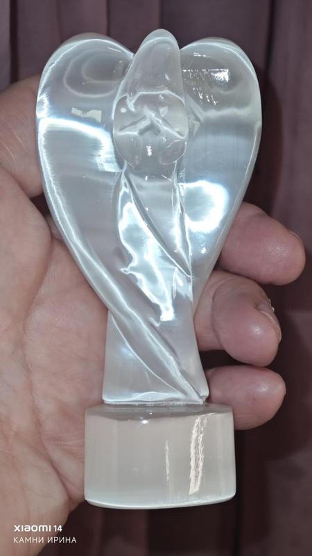 ## Селенитовая статуэтка Ангела - оберег из природного камня. Статуэтка - размер анфас 125*60 мм.; вес 150 гр. Селенитовая статуэтка Ангела - это утончённое изделие из природного минерала, воплощающее свет, защиту и духовную гармонию. Название «селенит» происходит от греческого слова «selene» - Луна, ведь камень обладает мягким, лунным сиянием. Этот минерал относится к разновидностям гипса и добывается в основном в Мексике, Марокко и США. Селенит отличается полупрозрачной структурой и нежным перламутровым блеском, который придаёт фигурке особую лёгкость и воздушность. С древних времён селенит считался камнем ясновидения и интуиции. В виде ангела он символизирует небесного хранителя, покровителя и проводника между мирами. Такая статуэтка способствует умиротворению, развитию духовных практик, очищению ауры и снятию эмоционального напряжения. Её часто размещают в спальнях, медитационных зонах или на алтарях для усиления энергетической защиты. Селенит способен улавливать и нейтрализовать негативные вибрации, создавая вокруг владельца поле гармонии и внутреннего света. Считается, что селенит благотворно влияет на нервную систему, помогает при бессоннице, головных болях и стрессах. Он усиливает концентрацию, снимает тревожность и способствует глубокому расслаблению. Селенитовый ангел - не просто декоративный элемент, а мощный духовный талисман, несущий свет и покой в каждый дом.