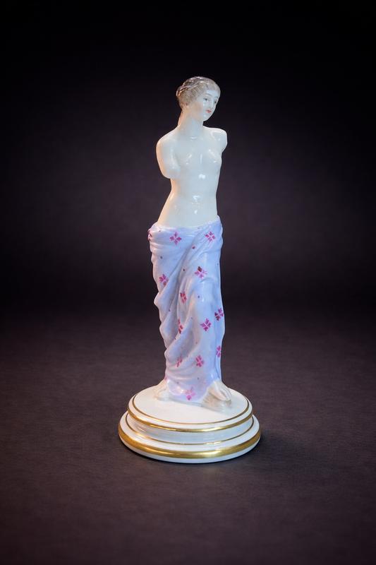 ⚜️ Порцелянова статуетка — оголена дама, інтерпретація Венери 🔱 Мануфактура — Capodimonte 🔱 Країна — Італія 🔱 Опис — витончена скульптура жінки з гладко покладеним волоссям, оголеним торсом і світло-блакитною драпіровкою з дрібними квітами. алюзія на класичну Венеру Мілоську. 🔱 Розмір — висота 18 см