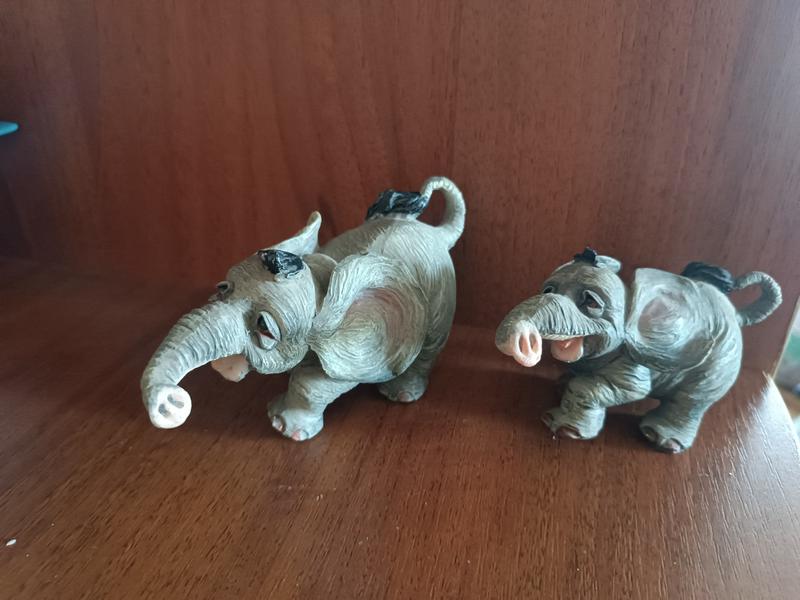 Статуетки слони. --- 🐘 Вінтажні фігурки слоненят — набір із 2-х Ці чарівні фігурки слоненят, виготовлені з матеріалу, що імітує камінь або кераміку, вражають деталізацією та емоційністю образу. Слоненята мають підняті хоботи -символ удачі та благополуччя -а також великі вуха, виразні очі й текстуровану поверхню, що нагадує справжню шкіру тварини. - 🎨 Колір: сіро-зелений із чорними та рожевими акцентами - 🧳 Ідеально для колекціонерів, декору інтер’єру або як талісман.