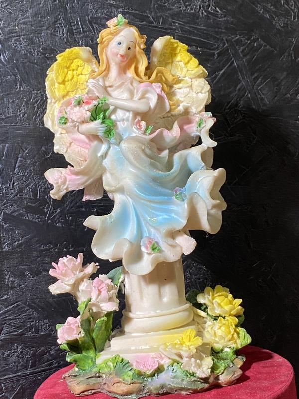 На зображенні показана фігурка ангела, можливо, серафима. Ця фігурка має ніжні деталі та одяг, що спадає, виконаний у м'яких тонах. Вона зображує ангела з кучерявим волоссям та витонченими крилами. Подібні фігурки можуть бути використані як центральний елемент для особливих подій, святкових прикрас або як цінне доповнення до колекції ангелів. Вони додають романтичного, химерного штриха камінам, полицям або вітринам.