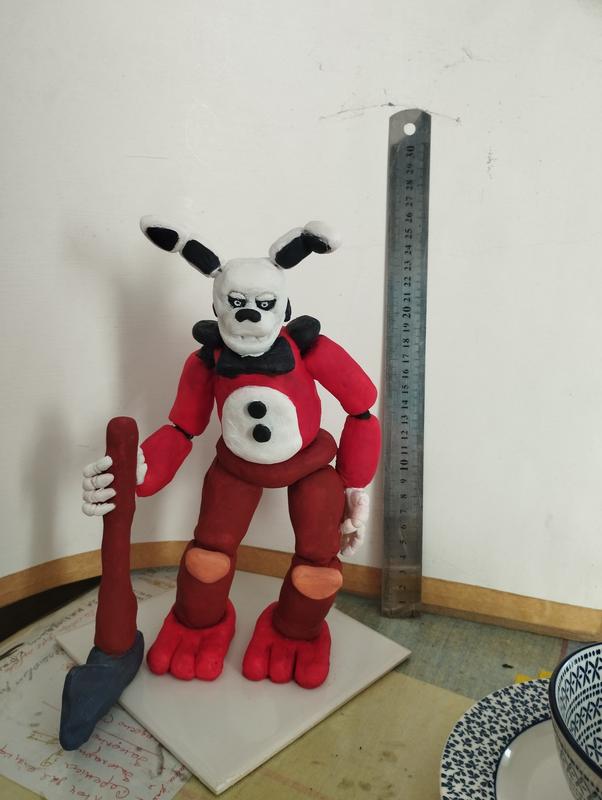 Фигурка “Аниматроник с топором” (в стиле FNAF) – ручная работа Описание товара: Уникальная фигурка, вдохновленная вселенной Five Nights at Freddy’s, выполнена вручную из полимерного пластилина. Имеет устрашающий и в то же время детализированный дизайн, что делает ее замечательным подарком для фанатов игры или коллекционеров авторских изделий. Характеристики: Материал: Полимерный пластилин (укреплен после высыхания). Высота: ~28–30 см (поруч для масштаба – линейка на фото). Цвет: Красный костюм, белая голова с черными деталями, белый живот с черными пуговицами, топор с темным лезвием. Особенности дизайна: Длинные заячьи уши с черными кончиками. Злый выражение лица с детализированными глазами и бровями. Черная бабочка на шее и декоративные элементы на плечах. Большой топор в руке – символ угрозы и хоррор-эстетики. Состояние: Абсолютно новая, изготовленная вручную, каждая деталь вылеплена отдельно. Назначение: Декоративный элемент, коллекционный сувенир, подарок для фанатов FNAF. Уникальность: Каждая фигурка проводится вручную, поэтому нет двух абсолютно одинаковых. Вы получите настоящий эксклюзив!