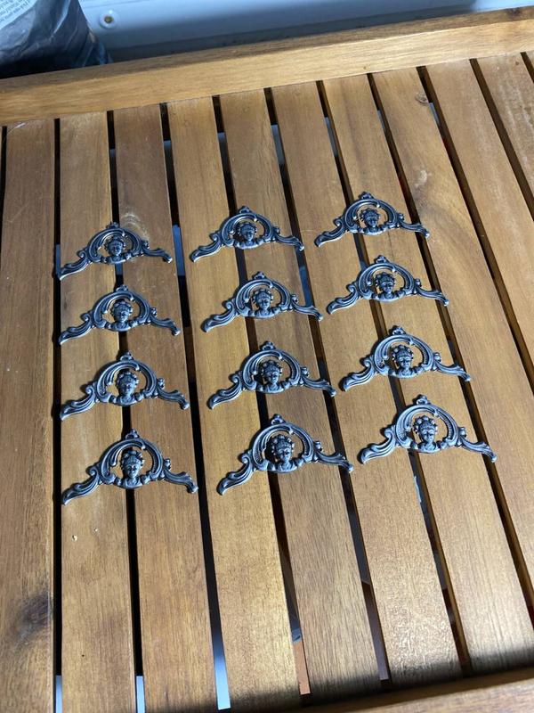 Имеются небольшие отверстия для крепления. Предназначены для декорации часов, мебели или украшение каких-либо предметов по собственному усмотрению. В наличии 12 шт. Стоимость указана за все. Размеры: длина - 6 см., высота - 3,5 см