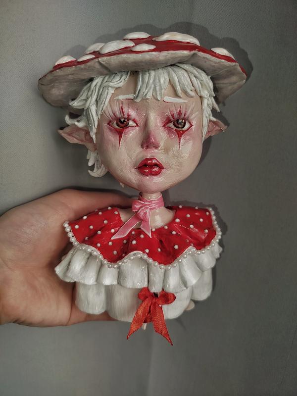 Фигурка сделана собственноручно, в виде девушки-мухомора. Изготовление из самозастывающей глины, окрашено акриловой краской и лаком. Предназначена для декора комнаты.