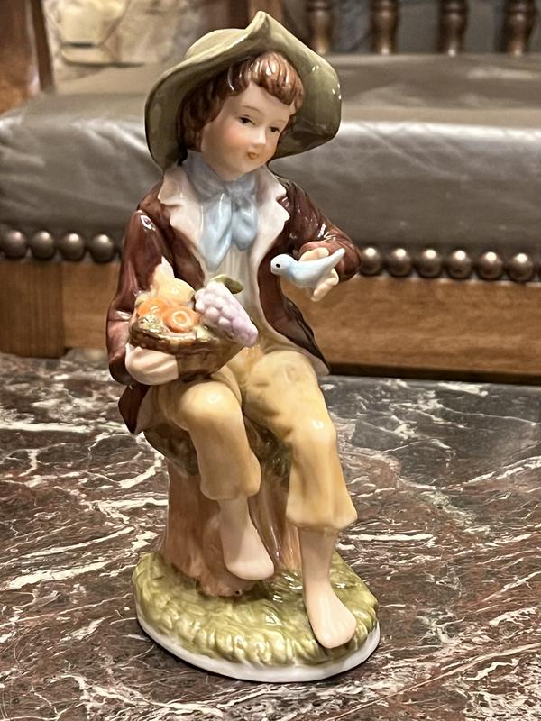 Винтажная фарфоровая фигурка мальчика с птичкой Размеры: • Высота: 17 см • Ширина: 9 см Стильная декоративная фигурка в винтажном стиле. Изображает мальчика в шляпе с корзиной фруктов и маленькой птичкой в руке. Выполнена из фарфора/керамики с глянцевым глазированным покрытием. Характеристики: • Материал: фарфор / керамика, глазурь • Высота: 17 см • Ширина: 9 см • Ориентировочный период: 1970–1990-ти • Состояние: очень хорошее, без повреждений Ценность: Такие фигурки часто собирают коллекционеры винтажной керамики. Они красиво смотрятся в интерьере и подходят в качестве стильного подарка.