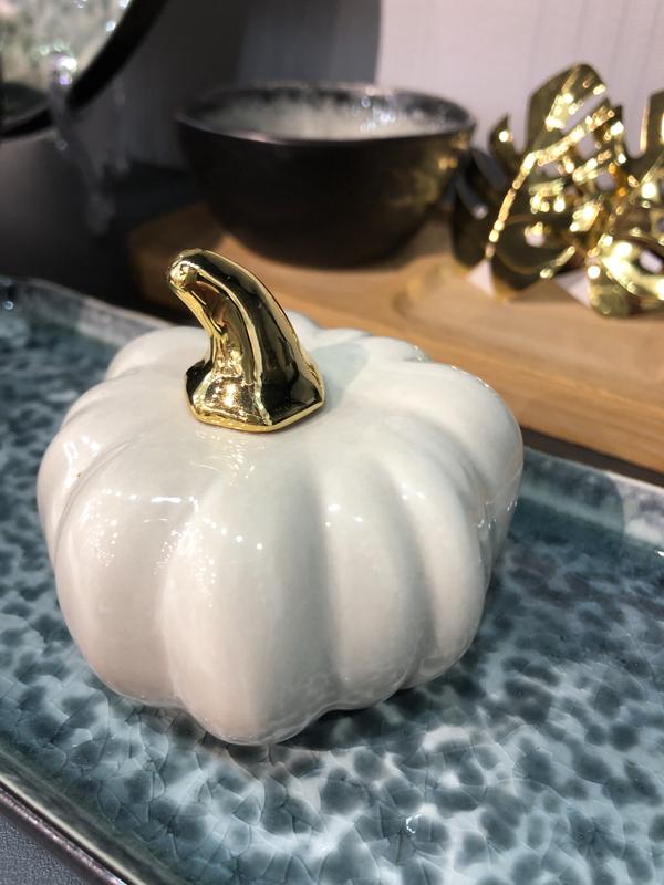 🎃 Білий гарбуз із золотим акцентом — естетика осені 🎃 Керамічний гарбуз діаметром 8 см — ідеальний для створення затишної атмосфери вдома чи в магазині. Глянцева поверхня, благородний білий колір і золотий стебель — поєднання, що додає стилю будь-якому простору. 🍁 Осінній декор, що пасує до класики, мінімалізму чи glam-естетики 📍 Матеріал: кераміка, метал 📏 Діаметр: 8 см 🎁 Можлива подарункова упаковка