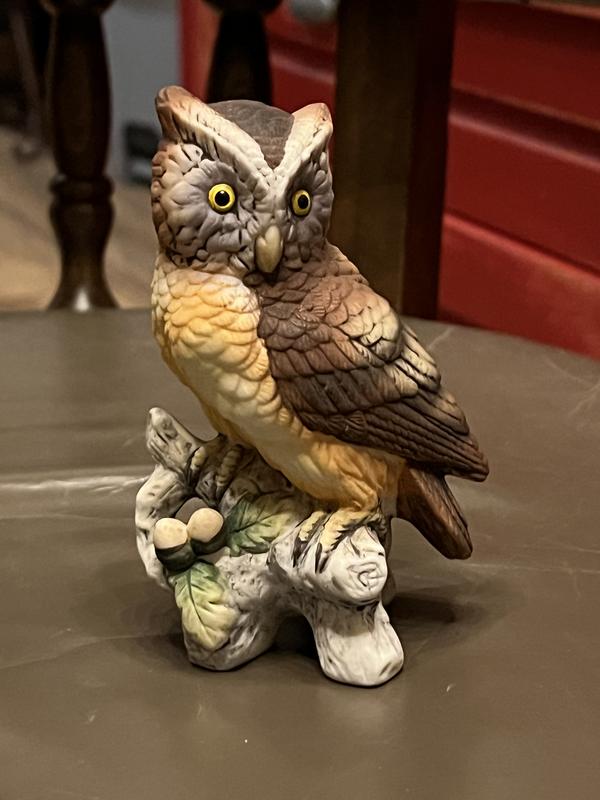 Фігурка сови (порцеляна, ручний розпис) Вишукана порцелянова фігурка сови, виконана з надзвичайною увагою до деталей. Реалістично передані пір’я, текстура кори дерева й виразний погляд жовтих очей створюють враження живої присутності. Розпис вручну з плавними переходами кольорів — від теплих охристих тонів до глибоких коричневих. Характеристики: • Висота: 12,0 см • Довжина: 7,0 см • Матеріал: порцеляна (або високоякісна кераміка), ручний розпис • Країна виробництва: Англія (Staffordshire) • Стан: чудовий, без тріщин, сколів і реставрацій Цінність: Декоративна фігурка середини — кінця ХХ ст., виконана з колекційною точністю. Ідеально підходить для інтер’єру в класичному або вінтажному стилі, а також як подарунок для колекціонерів чи любителів сов.
