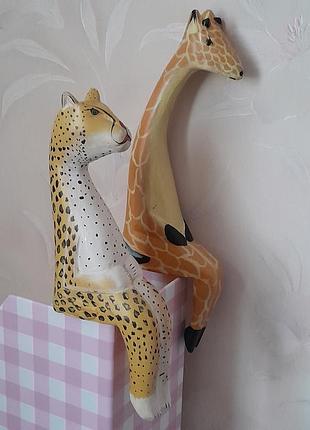 Цікаві статуетки сидячих звірів: леопард і жирафа. Довжина леопарда 15+ довжина лап 6см. довжина жирафа 19 + лапи 6см. Дерево розфарбовані масляною фарбою. Африка. ціна за обидві, продаю парою.