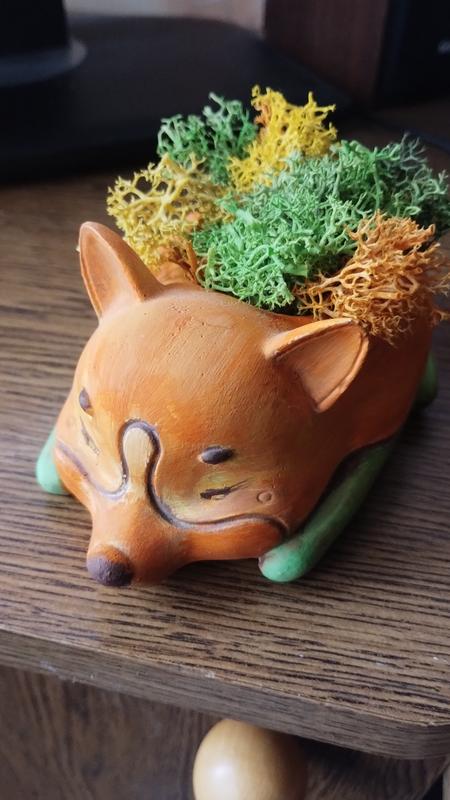 Статуэтка из гипса Корги. С натуральным высушенным мхом. Можно использовать как кашпо для маленького вазона
