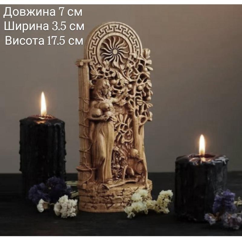 Статуэтка алтарная Персефона * * * - Производитель:Китай - Вес: 230 г - Длина 7 см - Ширина 3.5 см - Высота 17.5 см - Maтериал Полистоун Персефона - в древнегреческой мифологии богиня плодородия и царства мёртвых, владычица преисподней. Она также известна как богиня весны. Персефона тесно связана с земледелием и весенним пробуждением природы. Она также является царицей подземного мира и супругой Аида. В мифологии Персефона символизирует цикл жизни, смерти и возрождения.