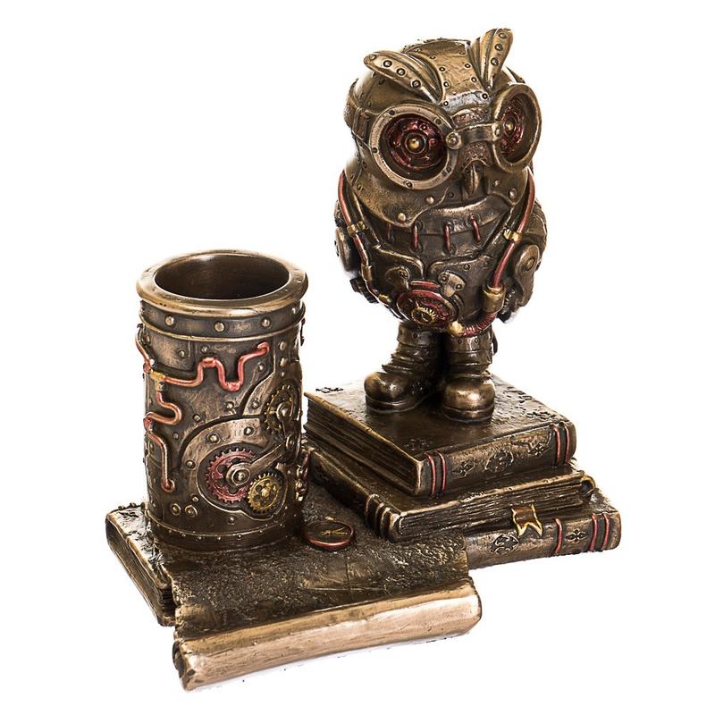 Статуэтка-подставка для ручек Veronese Сова 77491A4 размер 13х13 см Фигурки необычайной красоты в стилистике "Стимпанк" найдут своих почитателей среди ценителей искусства разных поколений. Фантастическая сова изготовлена из искусственного камня - полистоун с бронзовым покрытием. Символ мудрости и эрудиции придется по вкусу интеллигенции и работникам в сфере культуры и образования.